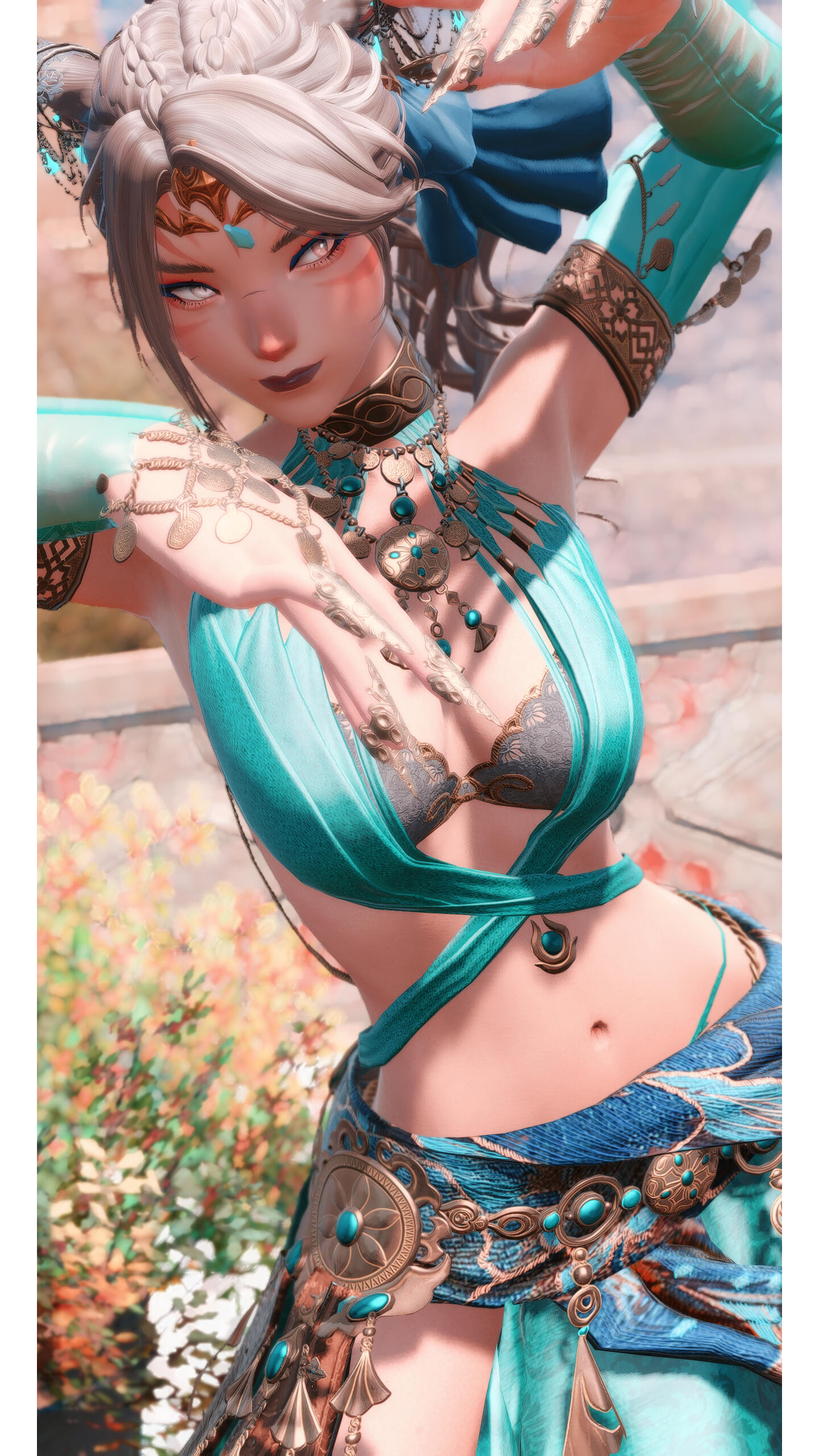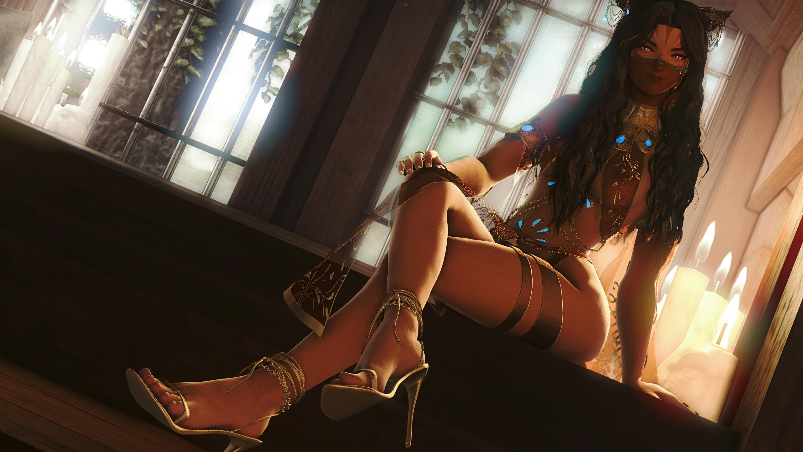X'aloh ran to the only befitting place left for her: Ul'dah.Taken under the "gracious" wing of an Ul'dahn noble, she learned to apply her voice to the streets, drawing passersby away from tempting stalls to stay and listen awhile (and hopefully toss a few gil pieces her way, at that). The art of dancing soon after followed; her feet were taught to fall in line with many other women like herself to join countless routines and appetizing shows. It was no open field of desert, but genetics helped to keep her from fatigue's door and inlaid muscle remembered the moves well. She was a fine specimen for the street, no matter how unkind and cruel they too could be on occasion.Years passed, and a friendship of the most unlikely sort saw to the transfer of her contract. Taken from the fanfare of the markets, X'aloh became a more prestigious act, one that was deserving of an actual stage, spotlight, and the pampering that she was owed, within a cabaret known simply as Infinity."Come one, come all, to catch a glimpse of the marvelous X'aloh: the up and coming songstress of the city's very heart!"As fame grew and experience was collected beneath her (metaphorical) belt, opportunities spread. New venues presented themselves. Private shows were requested. Prices climbed with each inked signature distributed. Far yet was she from the peak of success but it was spoiling all the same; X'aloh's pride doubled and then tripled with little effort — fueled with each and every rose thrown at her feet with a performance's end.