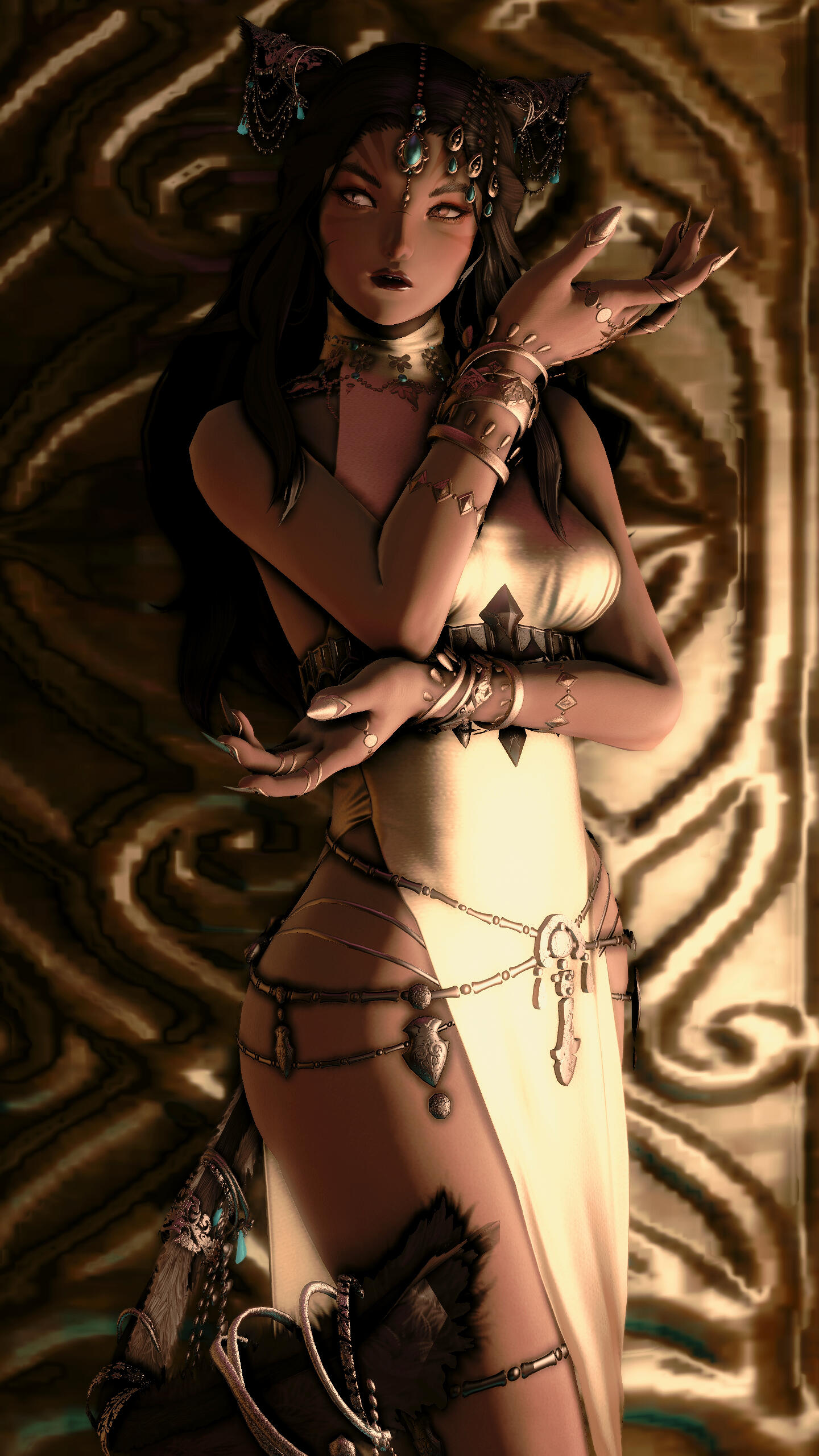 Bold fingers have always strayed from the drawstrings of bows and the grips of swords, favoring instead the call of lute strings and rivers of silken roads. Though a hunter's lineage runs rampant through this Miqo'te's blood, such exotic talents are reserved for the most social of sorts instead; dexterous feet and a balancing tail honed to the art of dance and entertainment of its fans.So too has her voice been molded to meet such court-side interests. What started first as a token hobby to pass the desert days away, soon became a beacon for prospective fame-builders. Many tales of those before her of the most daring spirits have fallen from her lips (and many coins have filled her pockets in due return). She has sung of the woes of lovestruck fools for those of the most sympathetic hearts, too, yet more often, she has sung of the vague semblance of lonely lasses without a place or side to venture to during the coldest of nights—all flourished with batting eyelashes and smiles most persuasive.As naïve as she may appear to be, there seems to be an element of hidden seasoning under the surface. Whether it be the out of place scar that travels from nose to cheek or the pointed steps that dictate the rotation of her hips, there is surely more to her ballads than random selection. Where the line falls between truth and fiction, however, is known only by the aforementioned artist.Between dramatic displays of oversaturated emotions and delightful indulgences, X'aloh Rahz certainly has - and will continue to - make a name for herself.