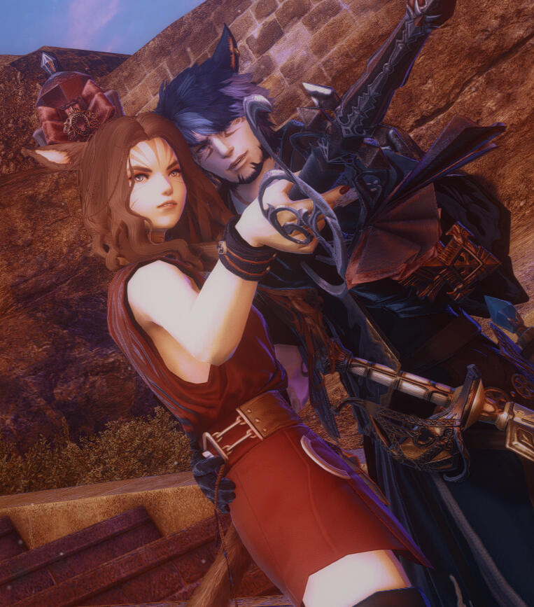New job opportunities naturally bring about new colleagues, and though little initially seemed to lay between these two, they found a singular spark in time: red magic. With an extension of connections (and selfless Seeker favors, of course), she and Esmond once found themselves as likeminded trainees under Fihpo'ya Rilohtan's tutelage when time permitted.Now that Esmond no longer pursues magic to the same degree, the two understandably spend less time together. Not that that comes to much surprise; she's heard that marriage life tends to do such a thing—what, with happy endings and the like.Despite that and perhaps to a degree of surprise, X'aloh enjoys the hyur's company and the atmosphere he brings. With infectious smiles and an upcoming protagonist's charm, Esmond influences X'aloh still to be optimistic about future adventures, and his dedication to her own magical advancement pushes her far more than she could ever push herself.